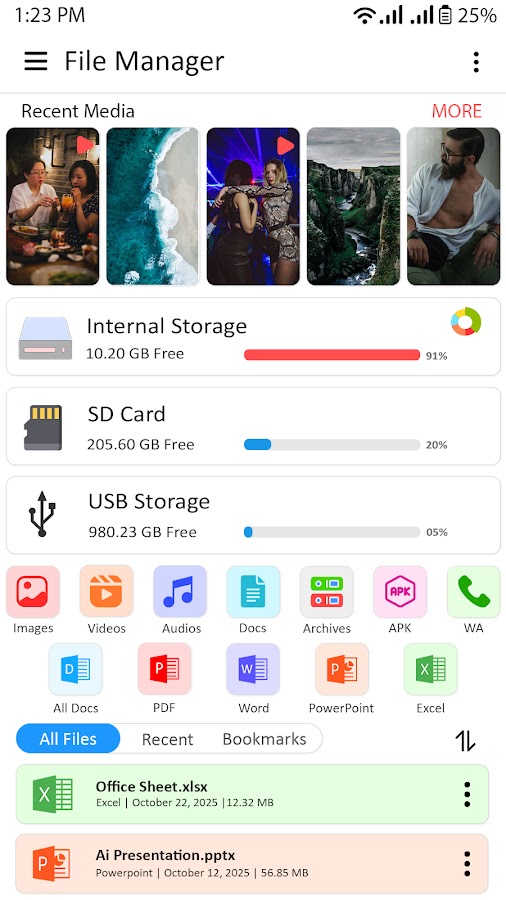 Легко просматривайте файлы по категориям, включая «Фотографии», «Видео», «Музыку», «Документы» (PDF, Word, PowerPoint, Excel), архивы, APK, «Скриншоты», а также папки «Недавние», «Загрузки», «Закладки» и «Избранное».