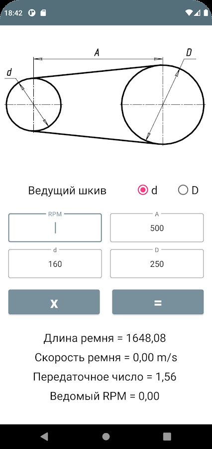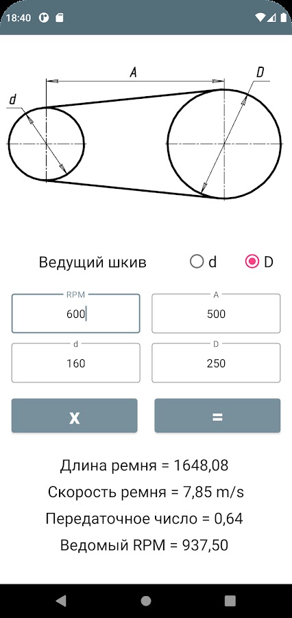 Так же приложение рассчитывает передаточное число.