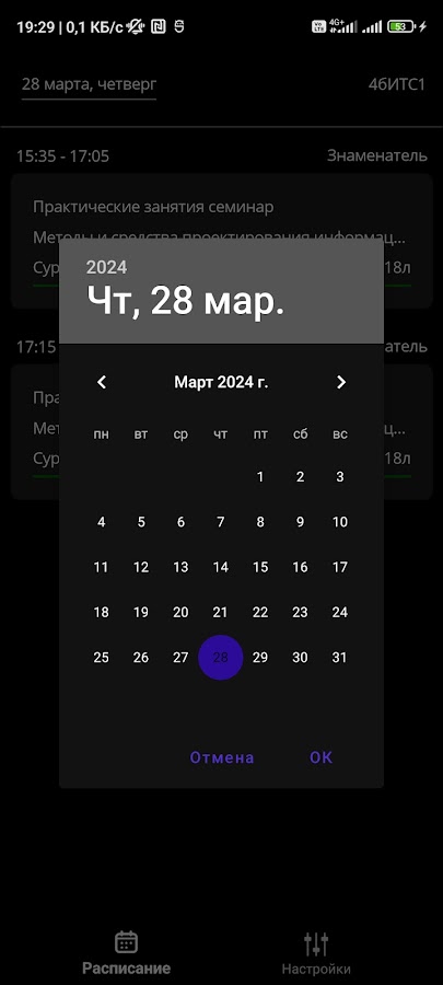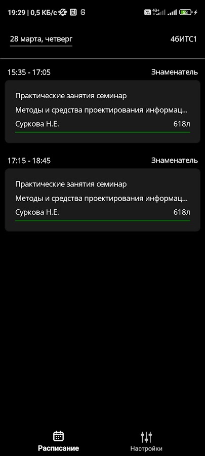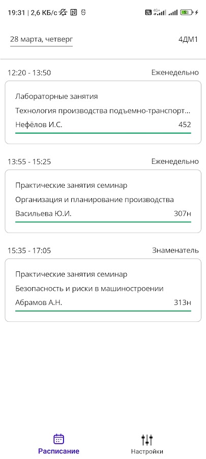 Удобное расписание пар для студентов и преподавателей с автоматической загрузкой информации с сайта МАДИ и разделением недель на «числитель» и «знаменатель».