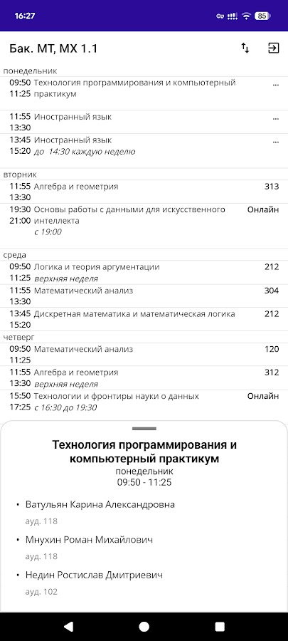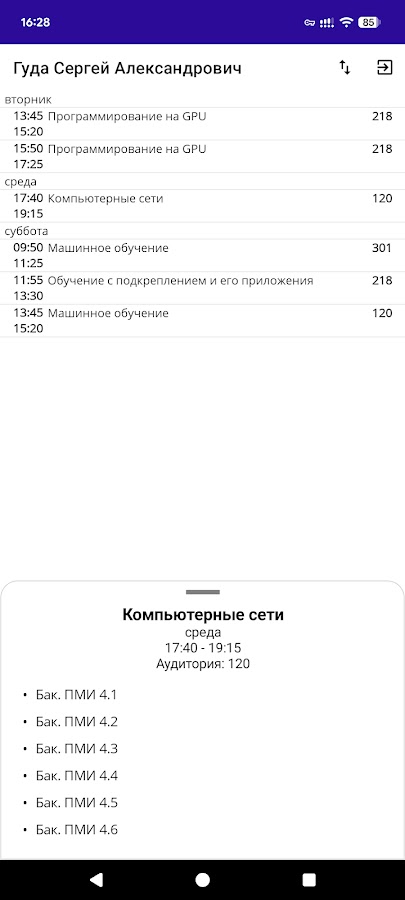университета. Выбирай курс и группу, если ты студент, или вводи фамилию, если преподаватель, — и актуальное расписание