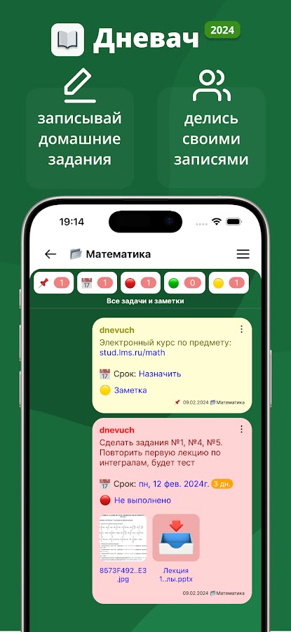 Дневач — это цифровой дневник для РГЭУ (Ростовский государственный экономический университет), в котором можно смотреть расписание занятий РИНХ, записывать домашние задания студентов, а также делиться своими записями с одногруппами. Кроме того в приложении доступны ленты со студенческими шутками, антистресс-играми и многое другое.