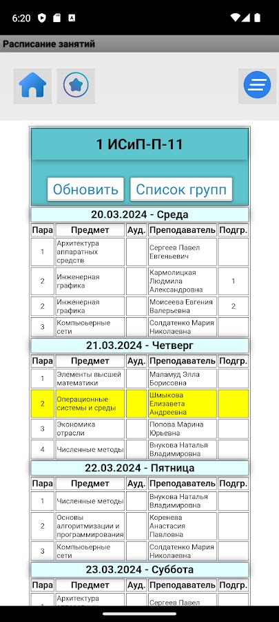 * Просмотр расписания группы