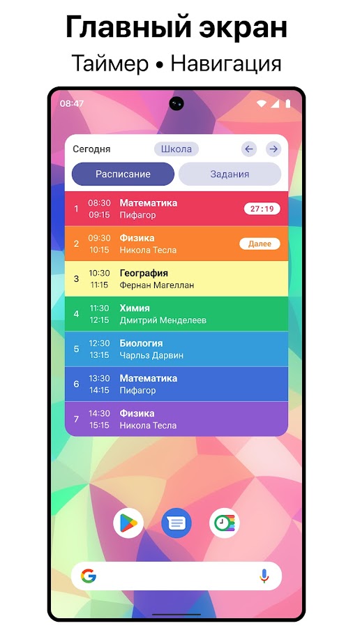 Вы можете разместить на экране удобный и функциональный виджет, который будет отображать ваше расписание и задачи. Кроме того, он покажет обратный отсчет до конца занятия. Вам не придется считать в уме, сколько осталось времени — просто взгляните на экран телефона.