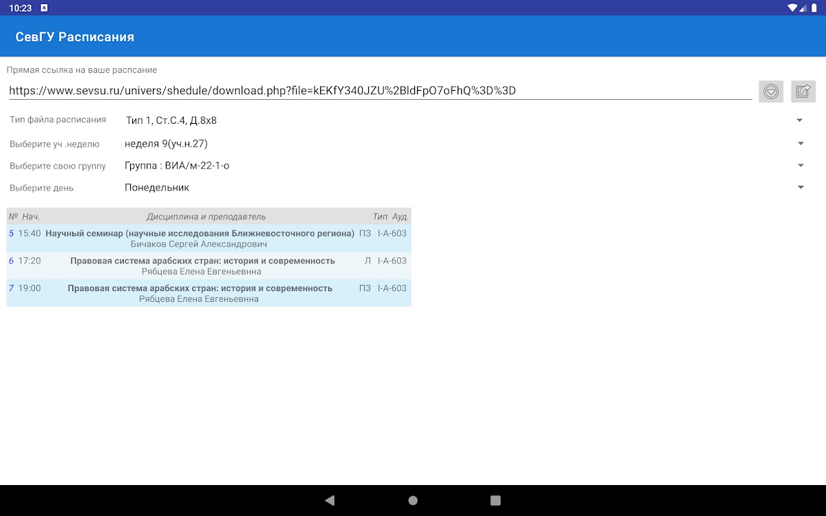 Перед вами не официальное приложение-парсер для Excel-файлов расписаний, загружаемых с сайта университета. Приложение способно скачать файл расписания, по указанной вами ссылке, разобрать его по вшитым правилам, и показать вам расписание именно вашей группы в нужный день. Если файл расписания был хоть раз скачан, то далее вы можете пользоваться им без интернета. Имеется возможность скачать расписание повторно, нажав на специальную кнопку (например, если у вас возникло подозрение что расписание устарело).