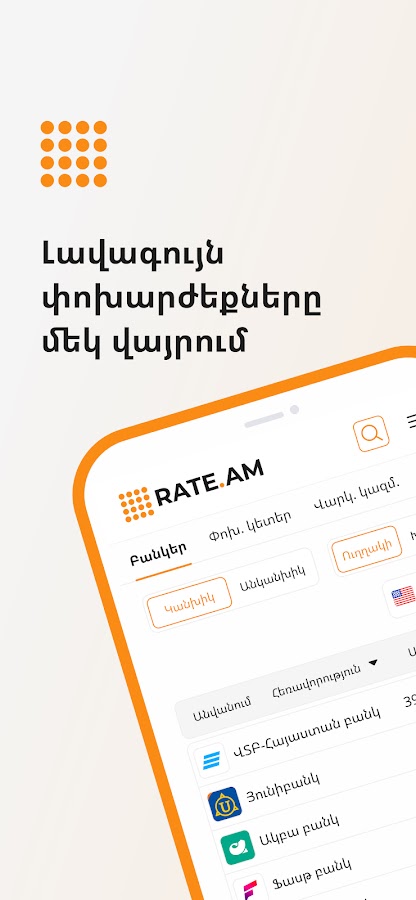 RATE.am является ведущим порталом финансовых услуг в Армении. Rate.am мобильное приложение является лучшим Android приложение, которое обеспечивает живые курсы обмена для популярных валют (USD, EUR, RUR, лари и т.д.) из всех армянских банков и большинства обменных пунктов!