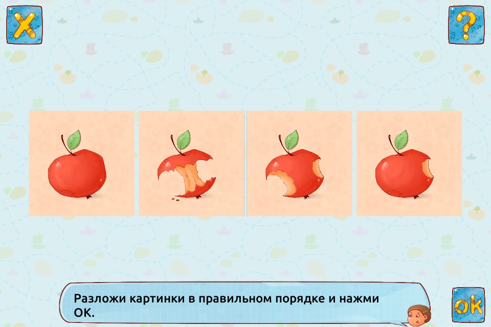 1. Легкий уровень – последовательность из 4 простых картинок, например: 1. целое яблоко, 2. откусанное яблоко, 3. яблоко съеденное наполовину, 4. огрызок.
