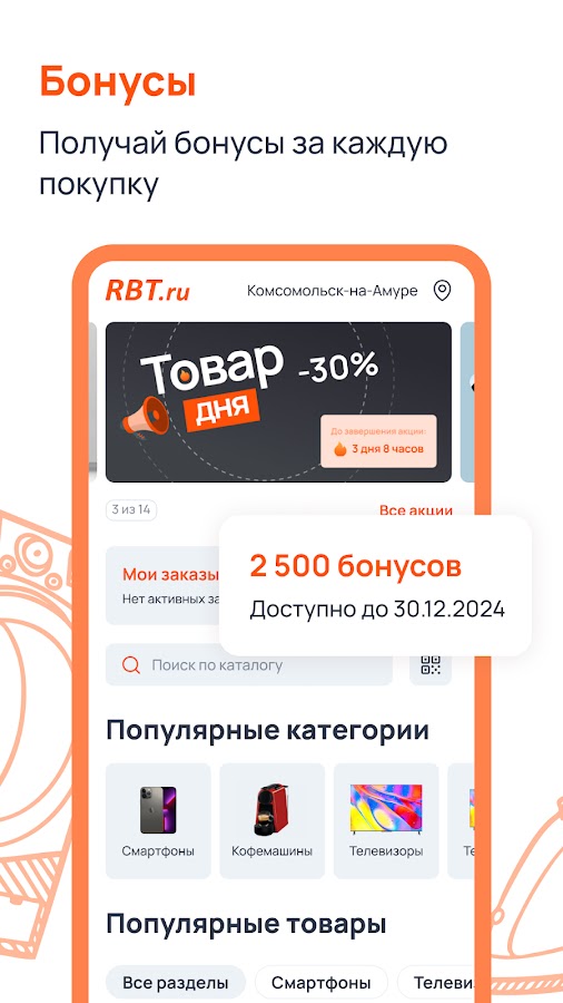 Мобильное приложение интернет-магазина RBT, которое позволяет совершать покупки электроники и бытовой техники онлайн 24/7 с доставкой!