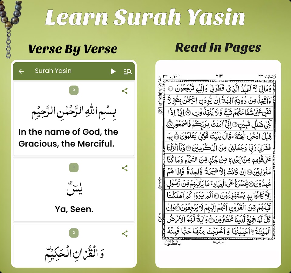 — Сура Ясин, которую называют сердцем Корана. Она обладает особыми духовными достоинствами, приносящими бесчисленные блага: