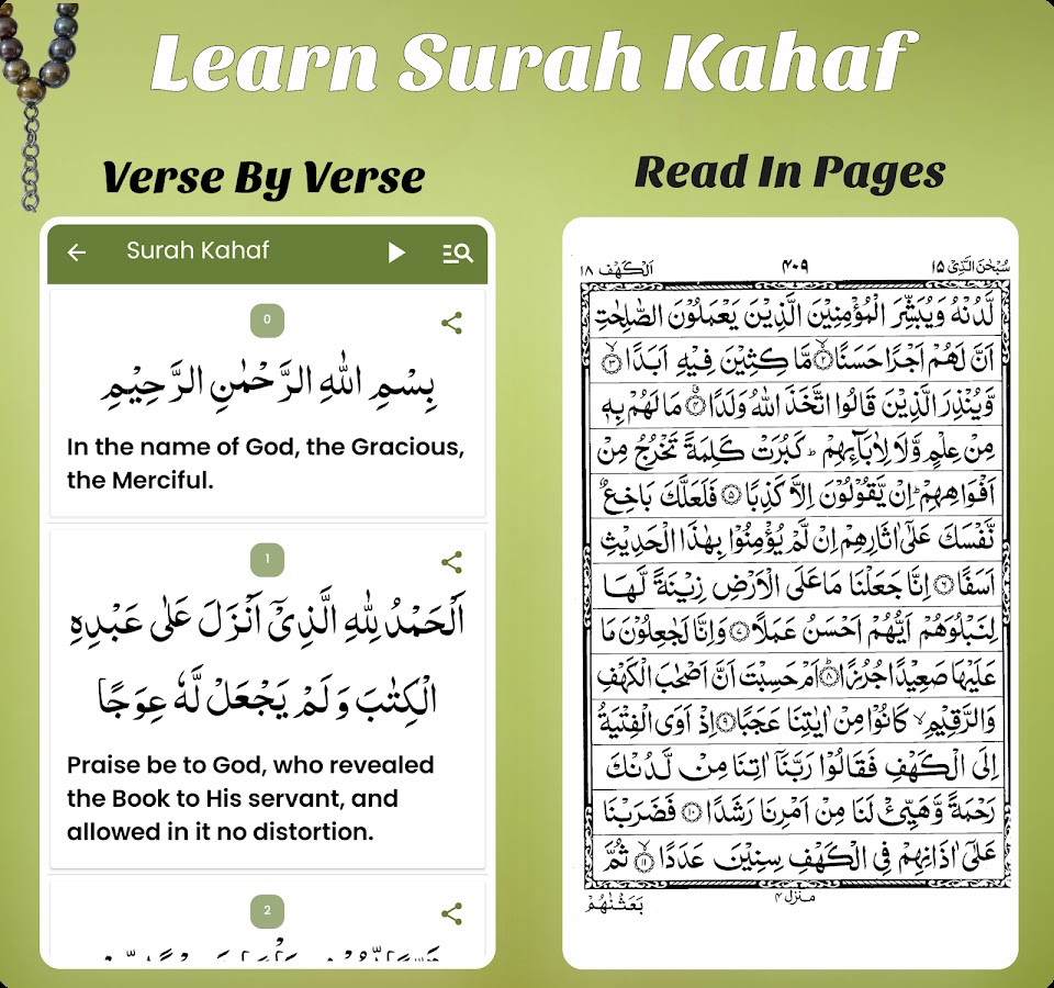 — Сура Кахф (также известная как Сорат Кахаф) рекомендуется для чтения по пятницам, чтобы получить защиту от искушений Даджаля и обрести мир и руководство для сердца.