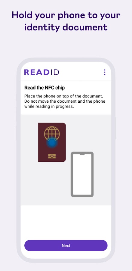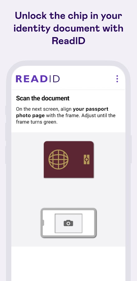 Приложение ReadID Me (ранее известное как NFC Passport Reader) считывает и проверяет NFC-чип, встроенный в электронные паспорта, национальные удостоверения личности и другие документы, соответствующие требованиям ИКАО (электронные паспорта или, в терминологии ИКАО 9309, машиночитаемые проездные документы: MRTD). Приложение оптически сканирует (OCR) машиночитаемую зону (MRZ) для получения доступа к встроенному чипу. Затем оно считывает встроенный чип с помощью NFC и отображает биографическую и биометрическую информацию владельца документа, а также информацию о документе, после чего выполняются проверки безопасности, такие как активная аутентификация, аутентификация чипа и пассивная аутентификация, и отображаются подробные результаты.
