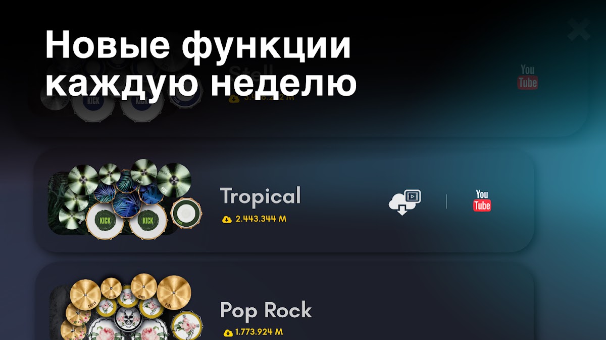 — Различные наборы ударных, включая реалистичные 3D-барабаны.