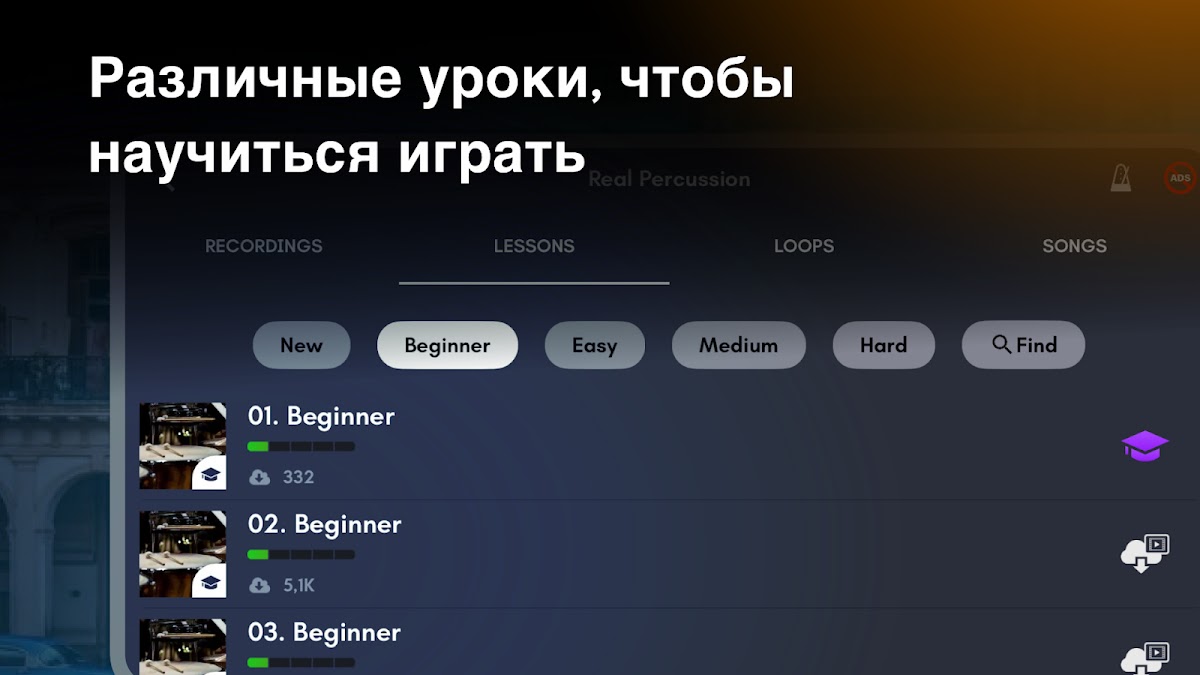 Почему стоит начать изучать ударные инструменты сегодня? Real Percussion предлагает десятки видеоуроков и интерактивных лупов, которые помогут вам играть вместе с инструментом. Независимо от того, новичок вы или профессионал, этот симулятор — идеальный способ изучить мировые ритмы в увлекательной и простой форме.