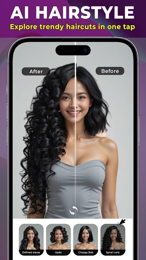 Это приложение работает со всеми типами волос — прямыми, волнистыми, вьющимися и другими, — чтобы каждый мог найти свой идеальный стиль. Используйте камеру или загрузите селфи, чтобы попробовать разные образы в режиме реального времени. Продвинутый ИИ автоматически распознает ваши волосы, поэтому вы можете расчесать их одним касанием и улучшить любую область для безупречного результата. Это как будто у вас есть личная студия красоты на вашем телефоне.