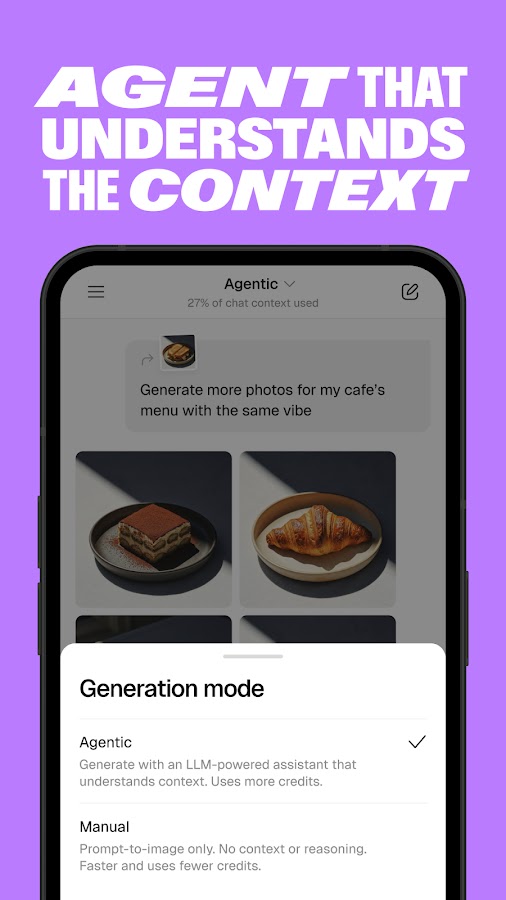Позвольте агентному режиму понять ваш контекст, проанализировать ваш запрос и автоматически оптимизировать каждую настройку. Или переключитесь в ручной режим для мгновенной генерации с полным контролем над каждым параметром.