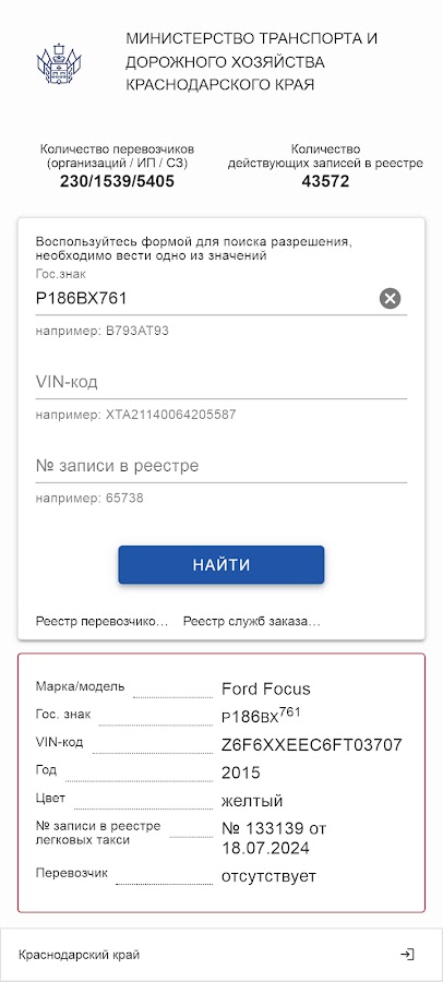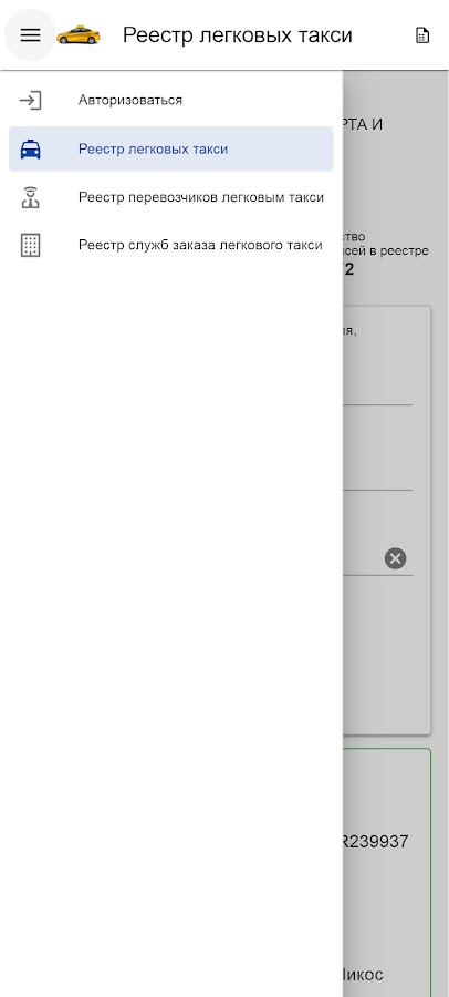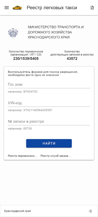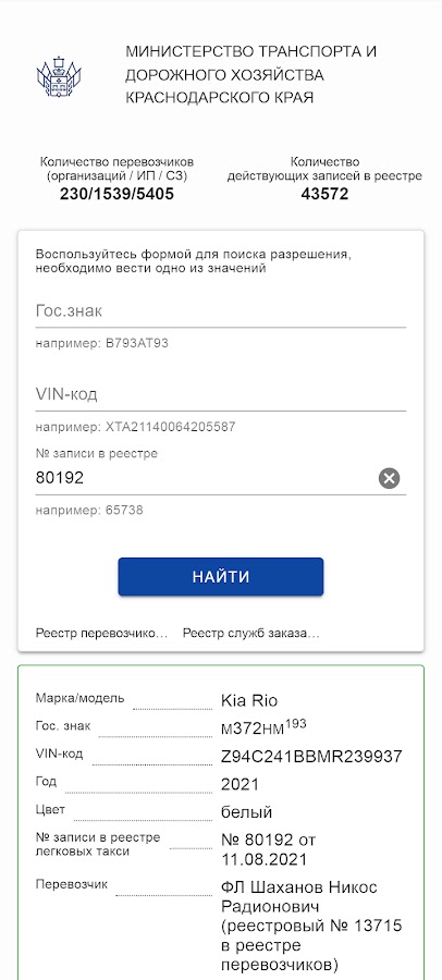 Мобильное приложение обеспечивает пользователей актуальной информацией о наличии разрешения на осуществление деятельности по перевозке пассажиров и багажа легковым такси. Основная функция приложения – проверка наличия и статуса разрешения по государственному регистрационному знаку автомобиля.