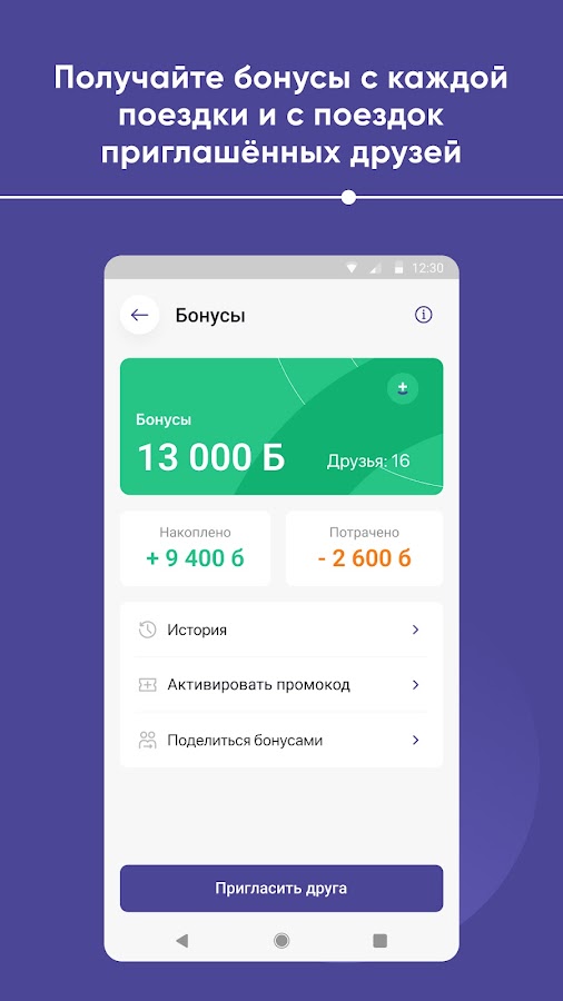 • Бонусная программа (получайте бонусы со своих поездок и с поездок приглашённых Вами друзей, делитесь бонусами с друзьями или оплачивайте свои поездки)