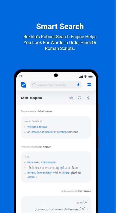 Приложение Rekhta Dictionary содержит самую большую коллекцию слов урду с подробными значениями и определениями, включая происхождение слова, правильное произношение, использование, рифмование слов и многое другое.