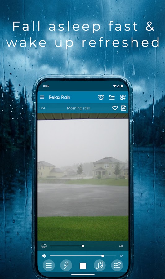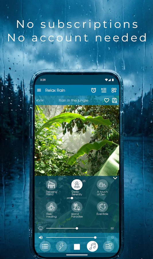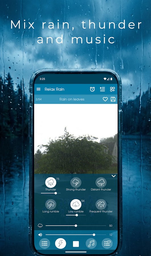 Вы можете индивидуально настроить громкость дождя, грома и музыки, чтобы найти идеальное сочетание и тем самым способствовать глубокому расслаблению ума.