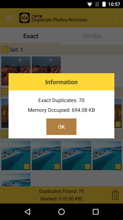 Приложение сканирует и отображает дубликаты или похожие фотографии в наборах. Затем он дает вам возможность удалить дубликаты фотографий, выбрав весь набор или набор изображений из него. Самое приятное то, что даже если вы удалите весь набор, это обеспечит сохранение одной копии фотографии. Ура !!!
