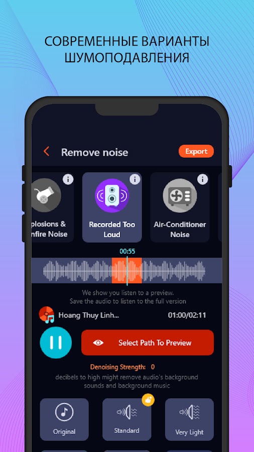 Загрузите Remove Noise: Reduce Background Noise Audio Теперь вы можете легко поделиться удивительным звуком после фильтрации шума с кем угодно через социальные сети.
