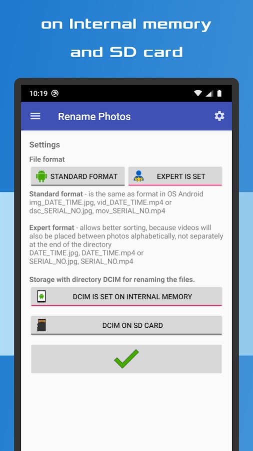 Отличное приложение для каждого пользователя. К тому же, в формате Эксперт видео файлы будут среди фотографий, по алфавиту, а не отдельно в конце папки. При переименовании на серийный номер приложение сохраняет последовательность порядка файлов по дате их создания, даже если какие-то файлы были удалены или добавлены.