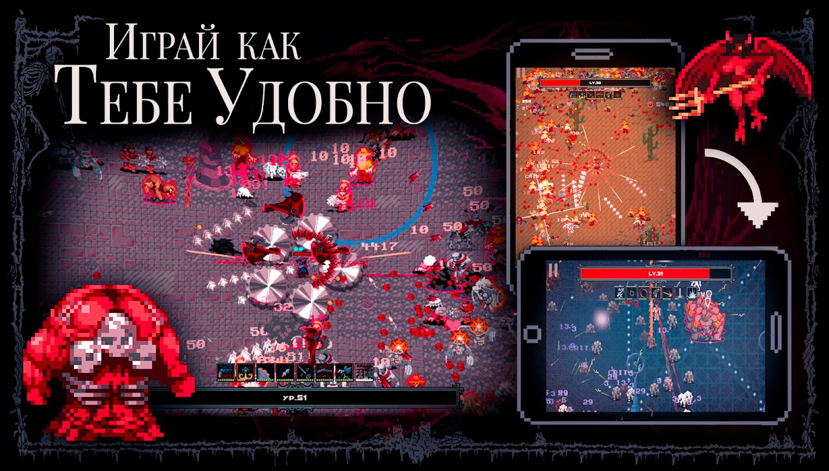🕯️ Ироничный и жестокий нарратив: Как пиксельный герой, ты изучишь настоящие хроники хаоса и встретишь смерть лицом к лицу в мире нашей хоррор-стрелялки, которая меняет традиционный формат жанра “ролевые игры и шутеры”.