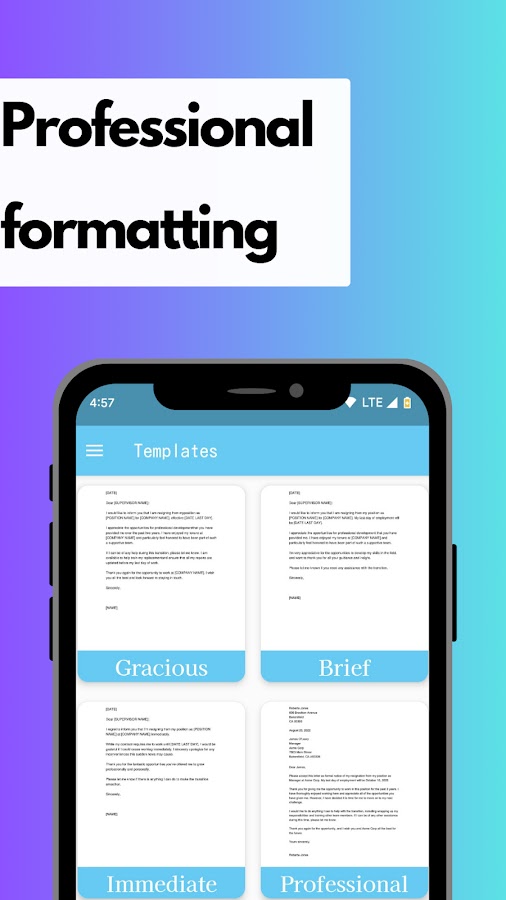 — Очень легко создать собственное письмо об уходе с работы, просто щелкнув образец формата.