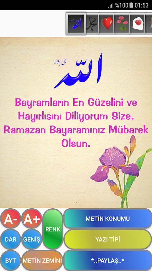 В нашем приложении есть готовые сообщения, которые вы можете использовать как изображения сообщений Regaip Kandili, Mevlid Kandili, Mirac Kandili, Eid Messages (сообщения Eid al-Fitr, сообщения Eid al-Adha), благословенные сообщения пятницы, новогодние сообщения, сообщения спокойной ночи, день Ашура, сообщения доброго утра, сообщения о любви и сообщения с изображением дня матери. Используйте изображения сообщений ко Дню святого Валентина на День святого Валентина 14 февраля. Поле сообщений, полное самых красивых сообщений. Если вы хотите, вы можете выбрать и использовать одно из готовых сообщений или внести любые изменения, дополнения или удаления в сообщения. Вы также можете использовать сообщение, которое вы напишете полностью сами.