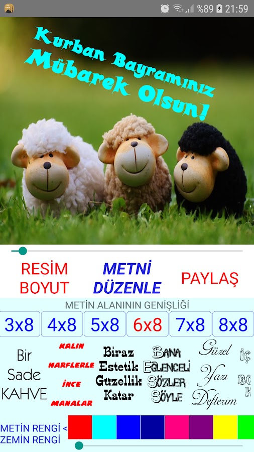 Чтобы поделиться сообщениями как текстовыми сообщениями, используйте кнопку «Поделиться» в нижней части экрана. Для сообщений с изображениями после выбора или написания текста сообщения нажмите кнопку «Создать сообщение с изображением». Вы можете использовать кнопки «Поделиться» на экране, чтобы поделиться сообщением с изображением. Ваши сообщения с изображениями также сохраняются в папке PictureMessages. Вы можете поделиться сообщениями, которые вы сохраните здесь позже. Таким образом, вы можете сделать более эффективные публикации с помощью картинок-слов. Когда вы хотите сделать заглавные буквы, вы можете настроить текст в нужном месте и использовать соответствующий цвет фона.