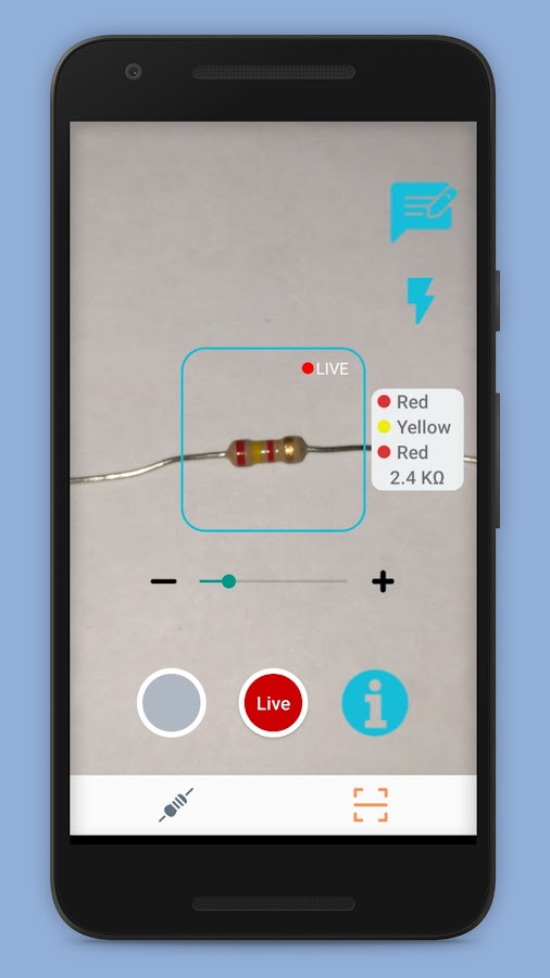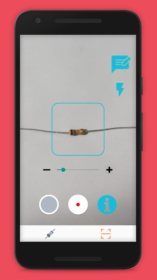 Камера в приложении настроена на автоматическую регулировку фокуса. Если фокусировка плохая, просто переместите камеру немного дальше от резистора и используйте полосу масштабирования, чтобы увеличить резистор в квадрате.