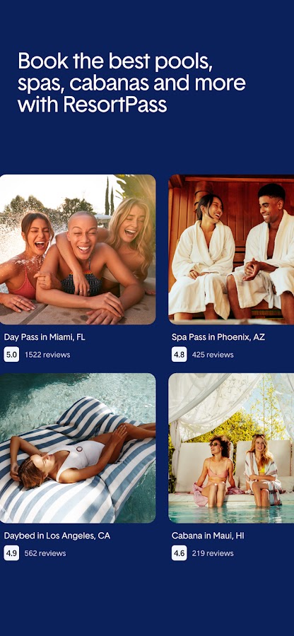 Хотите ли вы отдохнуть в одиночку, с друзьями или всей семьей, ResortPass найдется для каждого. Просмотрите тысячи невероятных удобств, впечатлений и пространств всего за 25 долларов. Благодаря более чем 1300 отелям в более чем 250 городах и более чем 27 странах ResortPass позволяет легко насладиться роскошным отдыхом, даже не покидая город.