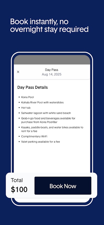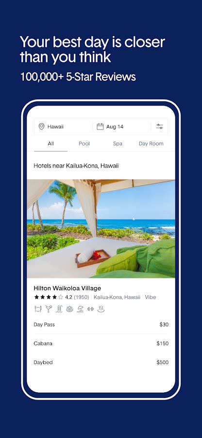 Получите доступ к роскошным удобствам отеля без бронирования на ночь! ResortPass сотрудничает с лучшими отелями и курортами мира, чтобы предоставить вам дневной гостевой доступ к бассейну, частному пляжу, спа-центру, фитнес-центру, рабочим местам и многому другому. Вы просто бронируете желаемые удобства, не бронируя номер! Идеально подходит для любого.