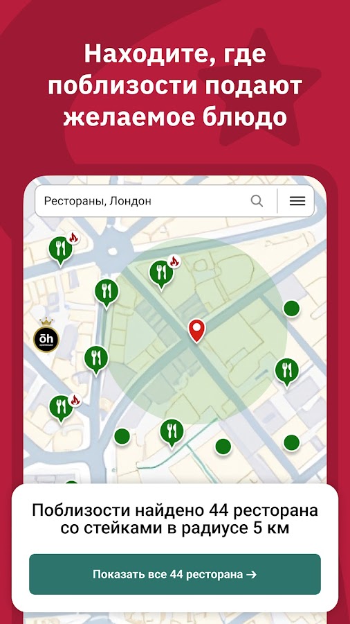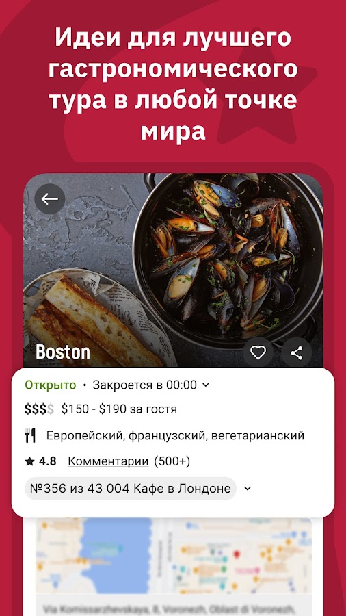 ★ найдите ресторан, указав блюдо, которое вы хотели бы попробовать сегодня. Находясь в любом уголке мира, вы легко найдете заведения, где можно заказать любимый борщ или пельмени на обед;
