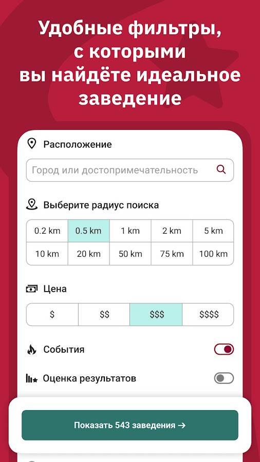 ★ подберите ценовой диапазон: от бюджетных закусочных до самых дорогих заведений;