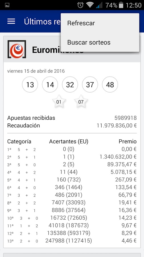 EuroMillions Verify – это розыгрыш европейского уровня, который состоит из 5 номеров и 2 звезд, а джекпоты обычно довольно высокие, самые высокие из всех, в то же время разыгрывается также EuroMillions Million, который принадлежит государству, но это на уровне уровень Испании, который состоит из комбинации букв и цифр, например ZDF41073, другие розыгрыши, такие как результаты Primitiva, Bonoloto, Lotería Nacional, El Gordo de la Primitiva, La Quiniela, Lototurf и Quintuple Plus, находятся только на уровне Испания и принадлежат государству, но категория с самыми большими джекпотами — это EuroMillions, все эти розыгрыши сохраняются в базе данных, где хранятся все результаты.