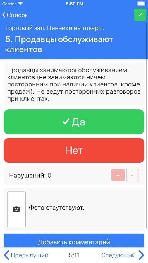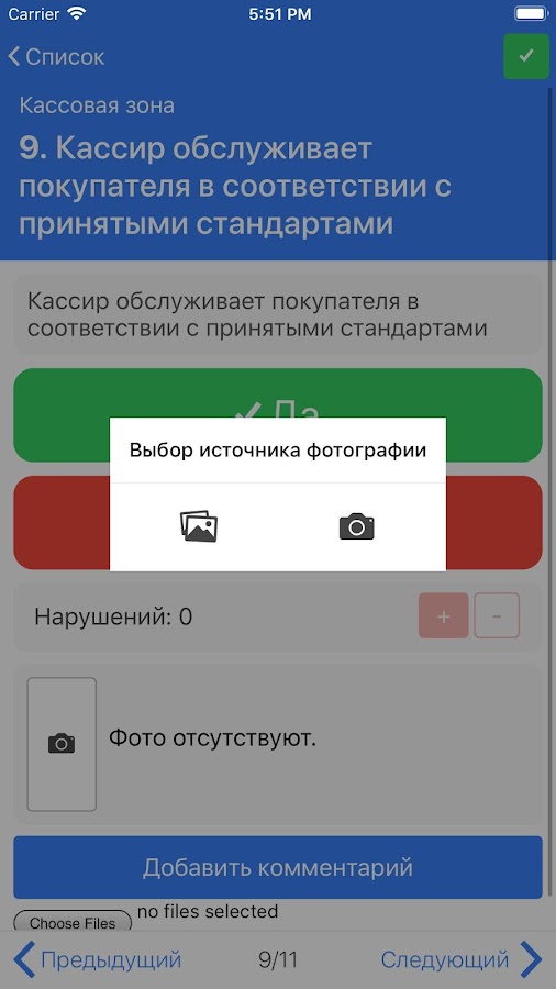 Мобильное приложение сервиса отлично подходит для использования в ходе выездных проверок, поддерживает работу в автономном режиме в условиях ограниченного доступа к Интернет. Используя приложение, вы сможете быстро и удобно заполнить чек-лист в требуемых категориях и областях проверки с указанием оценок, фиксацией нарушений и претензий, создать фотоотчеты и провести работу над ошибками с директором магазина или филиала для устранения нарушений.