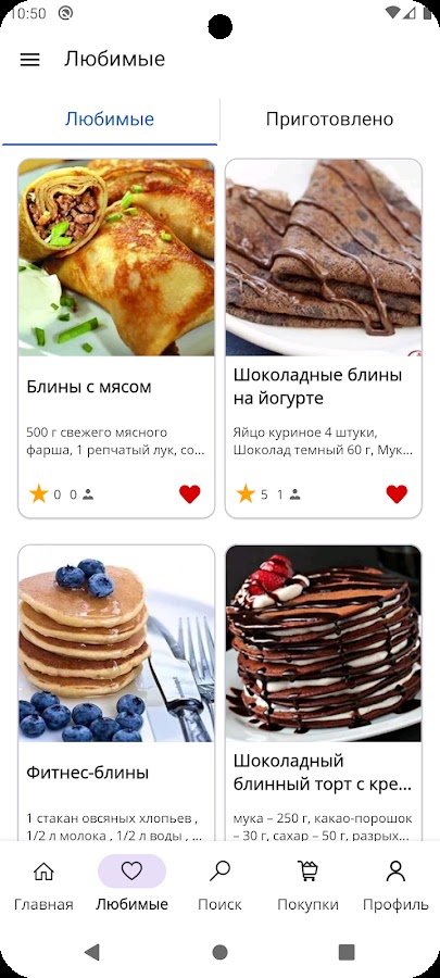 Все рецепты блинов разделены на категории для удобного использования. Также в приложении есть удобный поиск по названиям и по ингредиентам, который упрощает для Вас выбор рецептов.