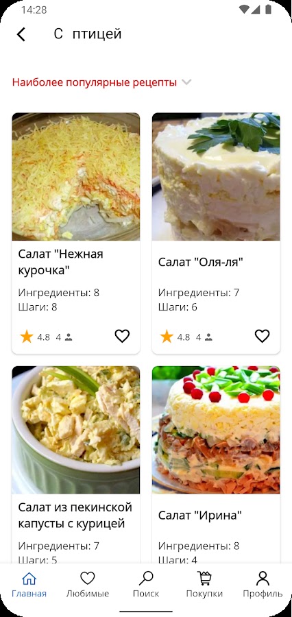 • В приложении есть удобный поиск по названиям рецептов и по их ингредиентам, который упрощает для Вас выбор рецептов