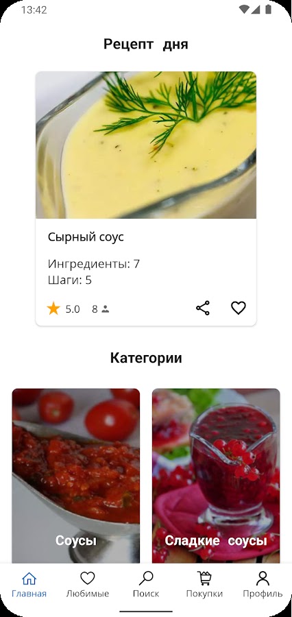— Избранное и Список Покупок: Сохраняйте свои любимые рецепты и составляйте списки покупок для мгновенного доступа.
