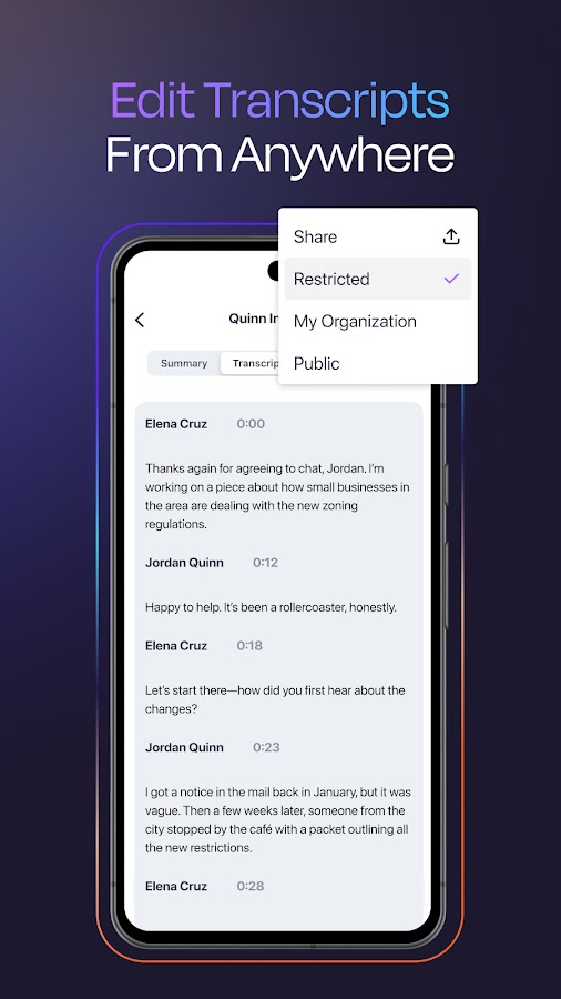 Мобильное приложение Rev позволяет вам записывать высококачественный звук прямо с вашего устройства* — идеально подходит для диктовки заметок по делу, проведения интервью или проведения исследований в полевых условиях. Мгновенно расшифровывайте с помощью ИИ или заказывайте человеческие расшифровки с точностью 99%+. Выделяйте, редактируйте и работайте над своими расшифровками совместно, синхронизируйте между устройствами и открывайте более глубокие идеи с помощью шаблонов ИИ и чата.