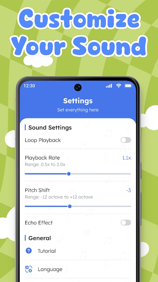 Запишите свой голос или любой другой звук прямо в приложении всего одним касанием. Встроенный диктофон чётко улавливает каждую деталь, готовый к воспроизведению или реверсу в любое время.
