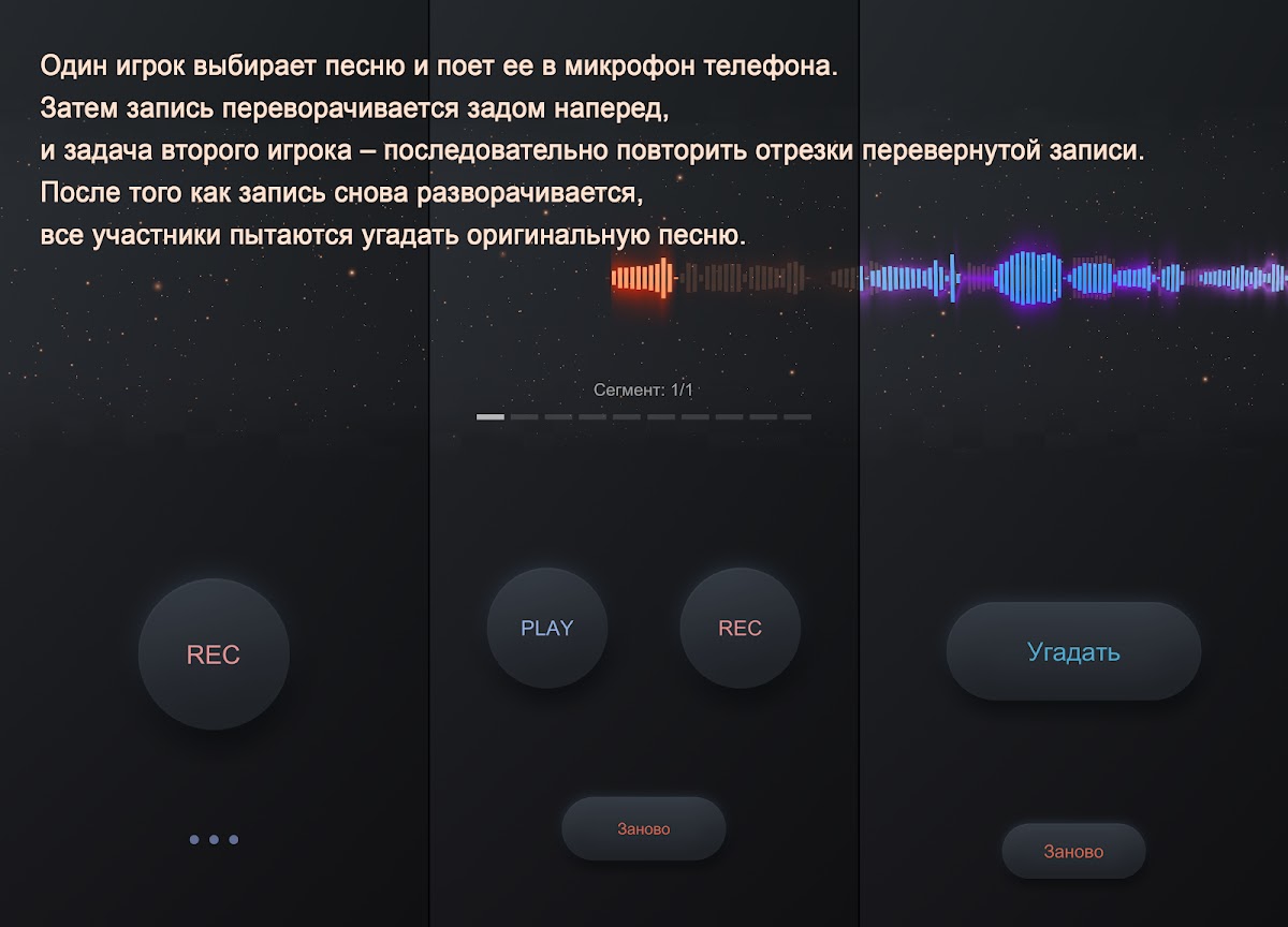 Погрузитесь в уникальный музыкальный мир с нашей новой игрой! Это веселая, захватывающая и полностью бесплатная музыкальная игра, на основе знаменитого конкурса АПОЖ, из телепередачи «Хорошие шутки», которую вел Александр Пушной. Эта игра принесет массу удовольствия вам и вашим друзьям. Один игрок выбирает песню и поет ее в микрофон телефона. Затем запись переворачивается задом наперед, и задача второго игрока – последовательно повторить отрезки перевернутой записи. После того как запись снова разворачивается, все участники пытаются угадать оригинальную песню.