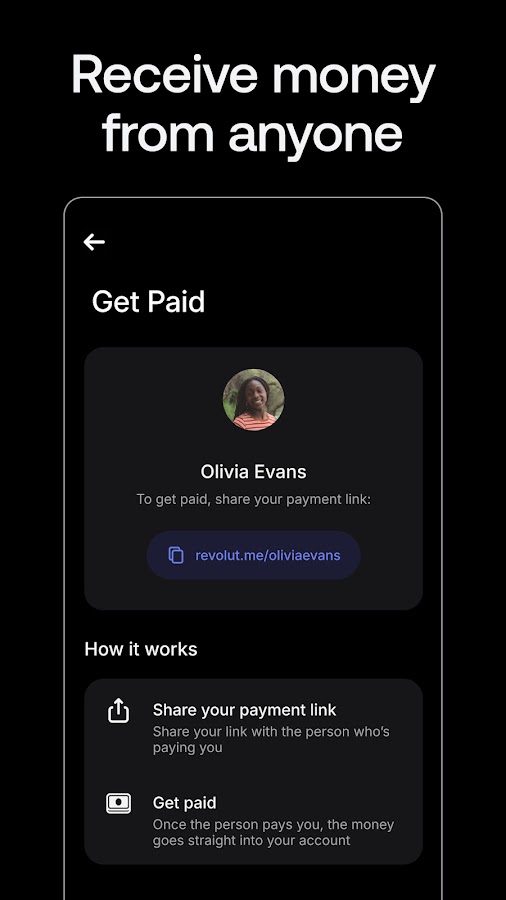 • Получайте деньги от всех — даже если они не зарегистрированы в Revolut — с помощью платежных ссылок
