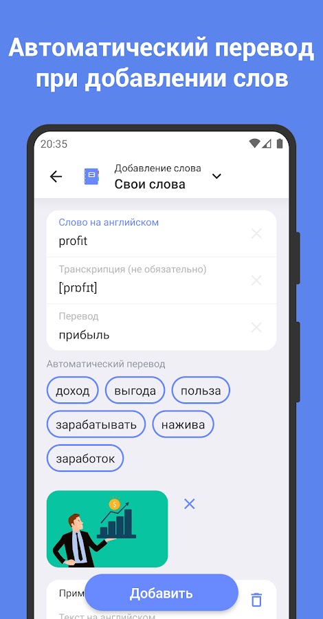 • Легко добавлять свои флеш карточки для запоминания слов: автоматически заполняются перевод, транскрипция, картинка и примеры.