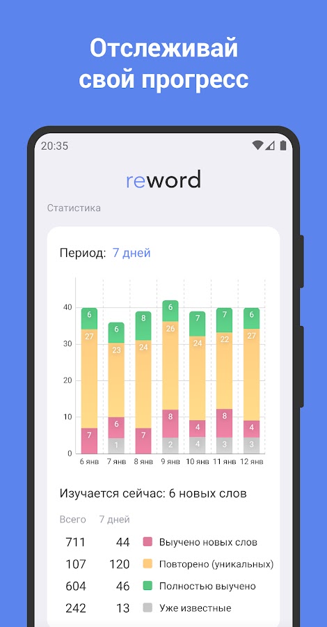 Если вам необходимо выучить English для работы, путешествий, либо чтобы просто смотреть любимые фильмы в оригинале и понимать сюжет — вам сюда! Более миллиона пользователей довольны, что пополняют свой словарный запас в ReWord!