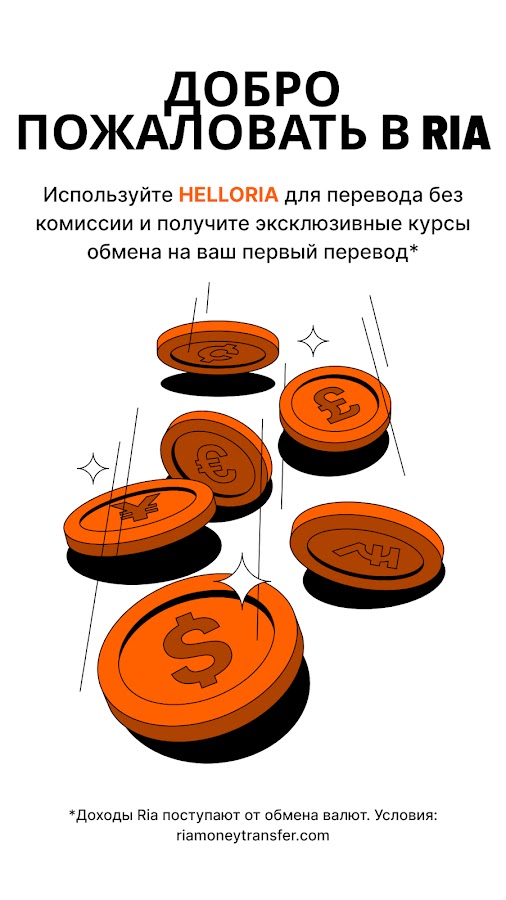 Условия определяются местом отправки. Промокод HELLORIA указывается при оформлении денежного перевода. Промокод предусмотрен для одноразового использования и не может применяться в сочетании с другими промокодами. Акция действует при отправке денежных переводов из мобильного приложения Ria или с веб-сайта Ria.