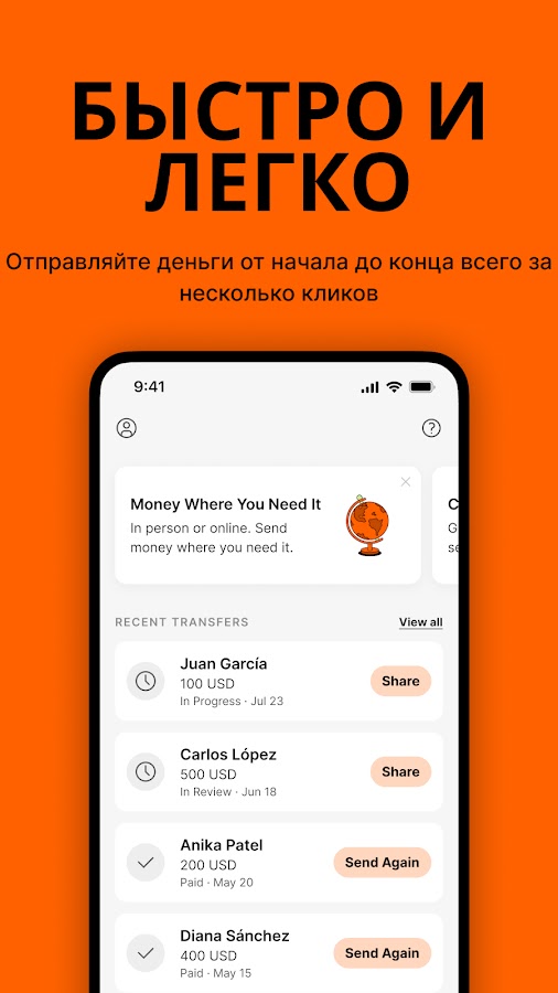 Клиенты постоянно отмечают «простоту использования» приложения Ria! Мы предлагаем несколько функций, которые улучшают процесс перевода. Вы часто отправляете одинаковую сумму одним и тем же людям? Тогда вам прекрасно подойдет функция «Отправить снова», позволяющая перевести деньги двумя касаниями. Вы хотите следить за процессом перевода? Используйте функцию «Отслеживать перевод», чтобы видеть движение своих средств.