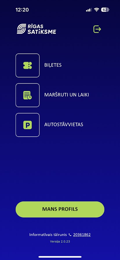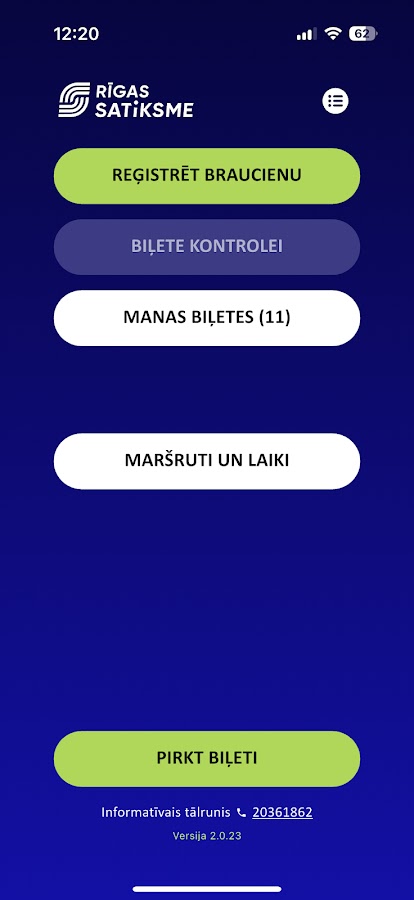 В разделе «Билеты» вы можете приобрести билеты на рижский общественный транспорт, зарегистрировать поездки и предъявить активированный билет контролеру. Доступны различные способы оплаты: платёжная карта, Apple Pay, Google Pay и интернет-банк. Билеты необходимо использовать в течение трёх месяцев с момента покупки. В разделе «Билеты» также можно просмотреть историю транзакций и поездок.