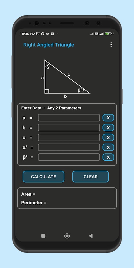 — Это приложение вычисляет значение сторон, угла, площади и периметра прямоугольного треугольника.