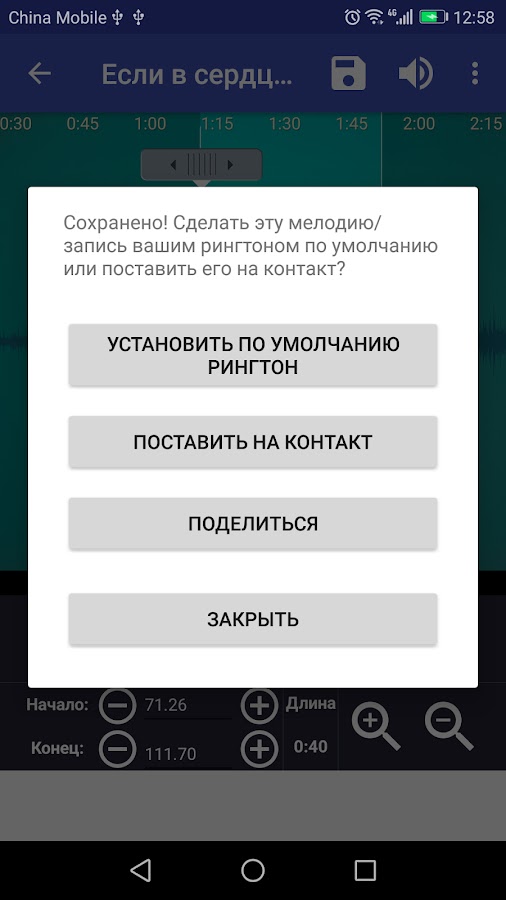 Сохранение обрезанного аудио как нового аудио-файла и установка его на музыку, рингтон, будильник или уведомления.